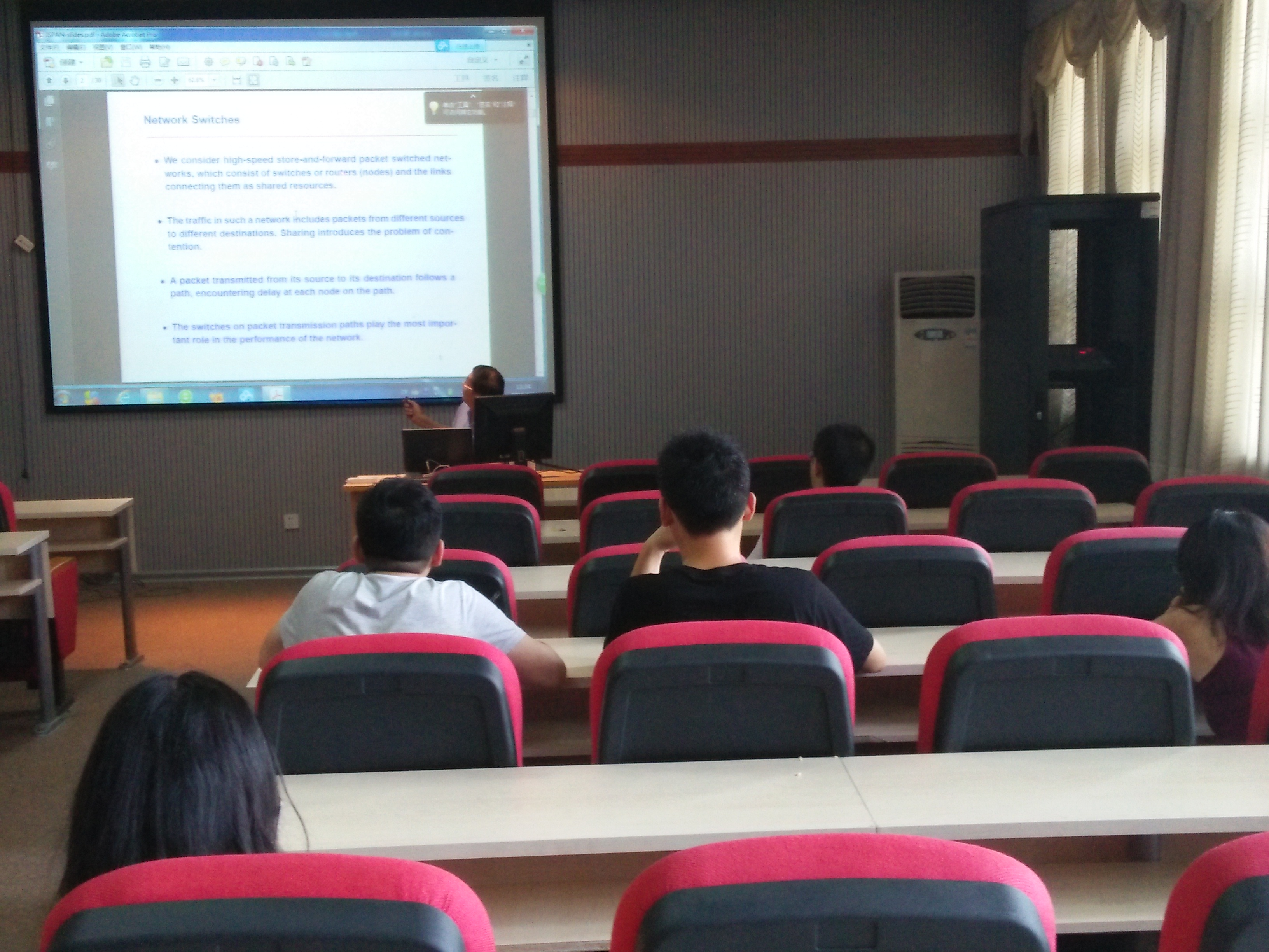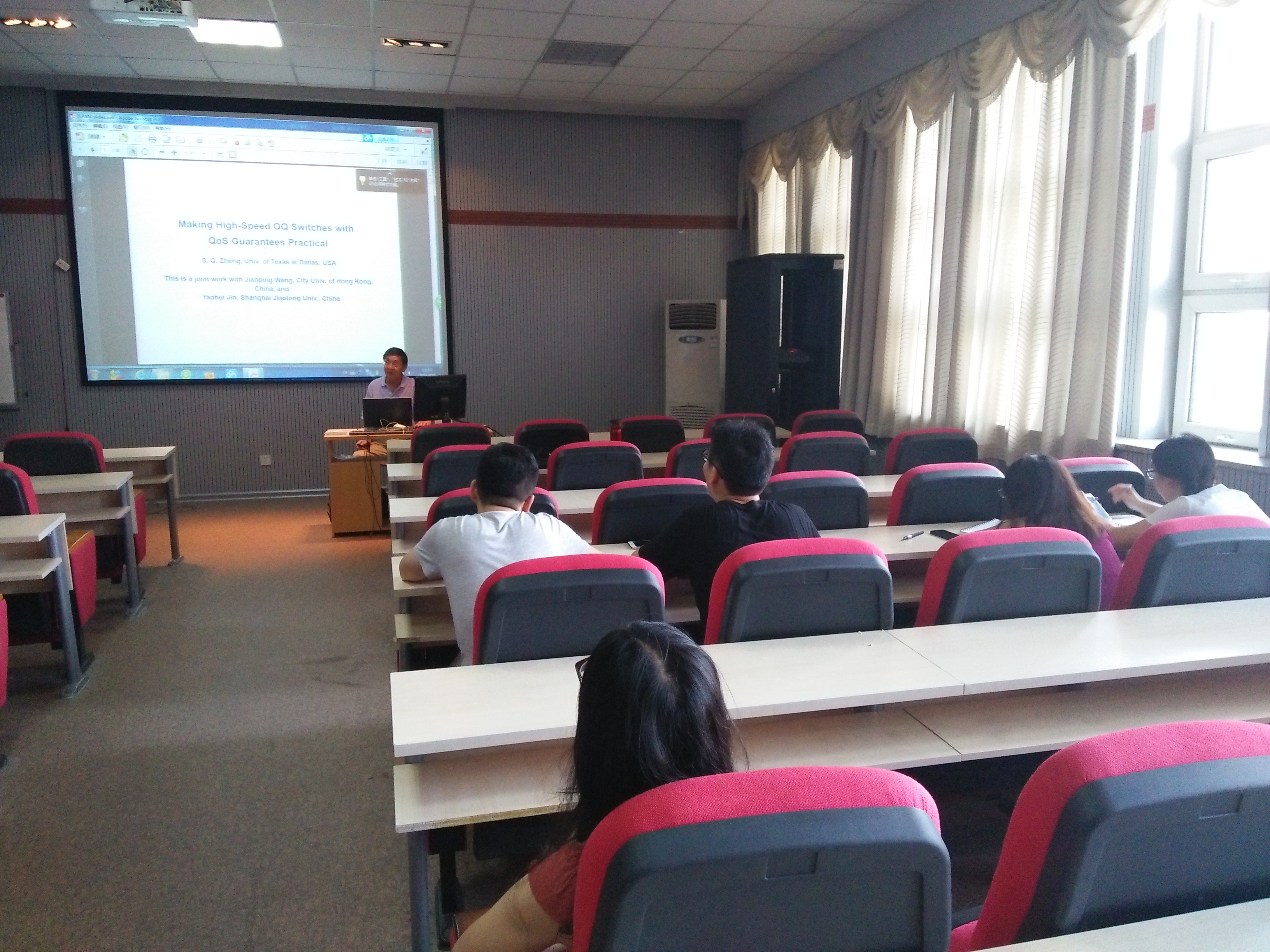 A521报告厅为计算机学院和软件学院的青年教师和研究生做了题为“Making High-Speed OQ Switches with QoS Guarantees Feasible”的学术讲座。该讲座的主要内容源于近期郑斯清教授与香港城市大学、上海交通大学合作研究的学术成果 – 构建易实现的高速输出排队交换结构。郑斯清教授同时在报告中讲解了研究和开发高速和可扩展交换结构的技术难点,以及介绍了该方面近十年的研究进展。整个讲座大约持续3个小时,分为两个阶段,主讲阶段约进行2个小时。主讲结束后,郑斯清老师解答了同学们提出的该方面的相关问题,同时,和同学们讨论了学术研究过程中寻找课题、研究方法等。