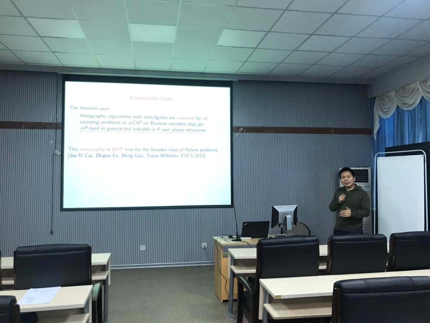 本次讲座的主要内容是付治国博士近期的研究成果,对于计数问题的计算复杂性、包括计数问题的计算复杂性分类等介绍了最新的研究成果,同时指出一些具有潜在研究意义的开放问题以及未来的工作。报告结束后又与在场师生探讨了讨论了如何扎实开展理论研究及未来如何开展相关研究领域的合作等问题。通过本次报告,使得在场的师生拓宽学术视野,取得了良好的收获。