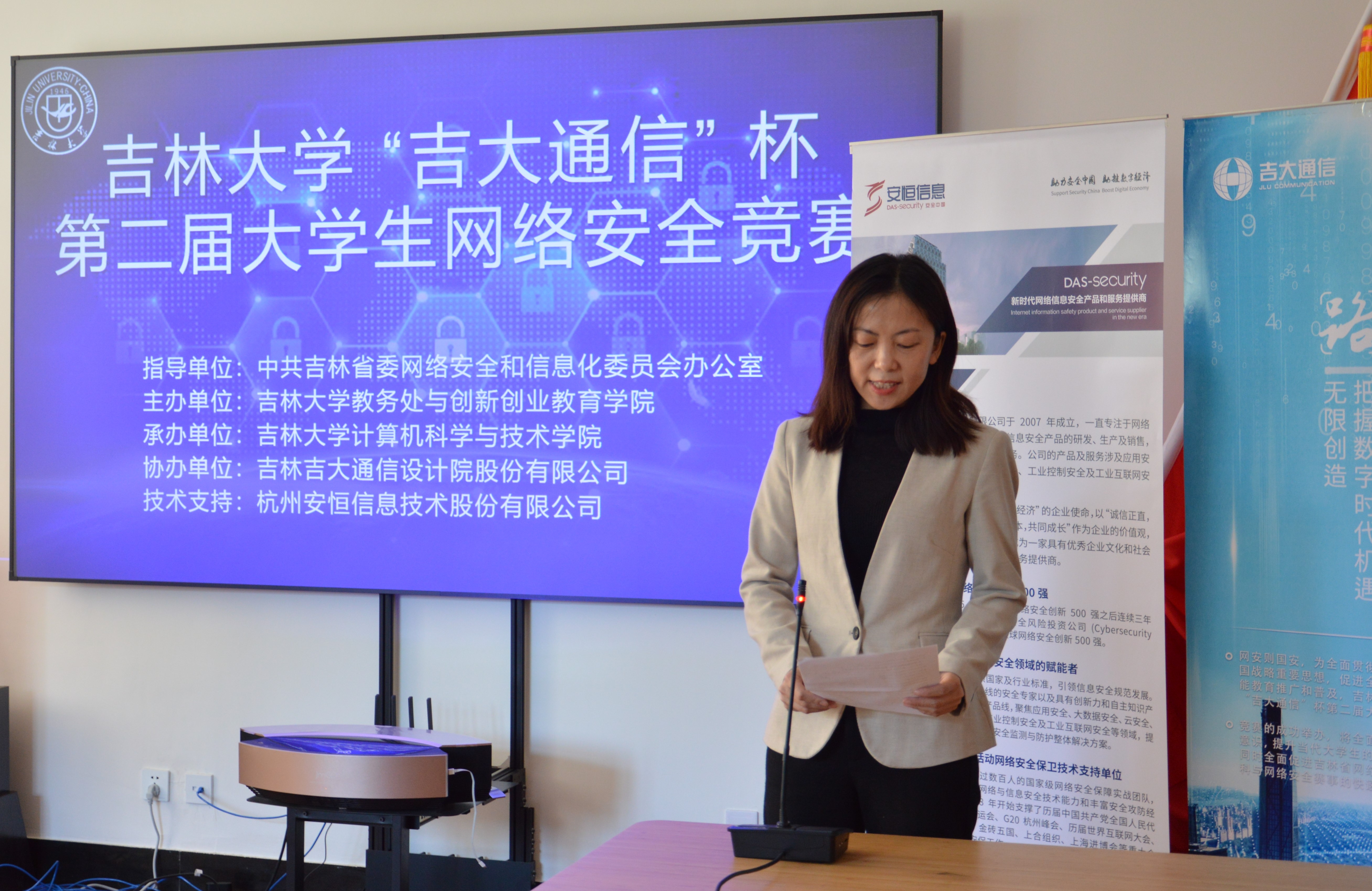 副院长黄岚教授发表了热情洋溢的讲话,她对获奖的同学表示祝贺,对协办单位吉林吉大通信设计院股份有限公司和技术支持单位杭州安恒信息技术股份有限公司的大力支持以及竞赛组委会的精心筹备表示衷心的感谢,并表示吉大人会“不忘初心、牢记使命”,河马影视