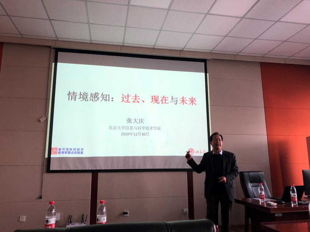 张大庆教授从情境感知的过去、现在和未来三个方面介绍了他本人以及所带领的科研团队在过去的十余年间在相关方面做出的科研成果,并对未来在情境感知领域的研究方向进行了介绍。首先,张大庆教授用生活中的实例,为大家介绍了生活中大家所能够接触到的关于感知方面的应用。之后,引出了在生活中,应用感知领域的知识结合现实生活,可以为人们的生活和科学研究带来哪些改变。之后,张大庆教授详细介绍了有关菲涅尔区模型和应用这个模型所能够实现的相关技术,解释了目前多数基于WiFi的识别工作效果不够稳定的原因。张大庆教授接着通过一段视频影像,更加形象生动的为大家介绍了其所做出的科研成果能够在生活中实现的应用。在报告的最后阶段,张大庆教授悉心的解答了到场同学所提出的相关问题,给大家之后的研究提供了新颖的思路。本次报告受到了广大老师和同学们的热烈响应。
