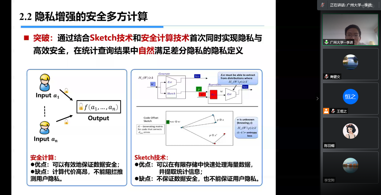 李进教授首先介绍了人工智能系统安全领域的研究现状,并结合相关的基础知识引出了机器学习任务在执行过程中面临的安全问题,其表现形式包括隐私泄露、投毒攻击等。接下来介绍了团队内的一些研究工作,涉及非交互式隐私保护的多方学习、隐私增强的安全多方计算等。同时还展示了相关的实验结果,体现机器学习隐私保护相关研究的必要性。并对未来的研究工作做了展望,主要包括人工智能的可解释性、对抗样本的数据跨域攻击等。报告结束后,李进教授悉心回答了老师和同学们提出的问题。本次报告受到广大师生的热烈响应。