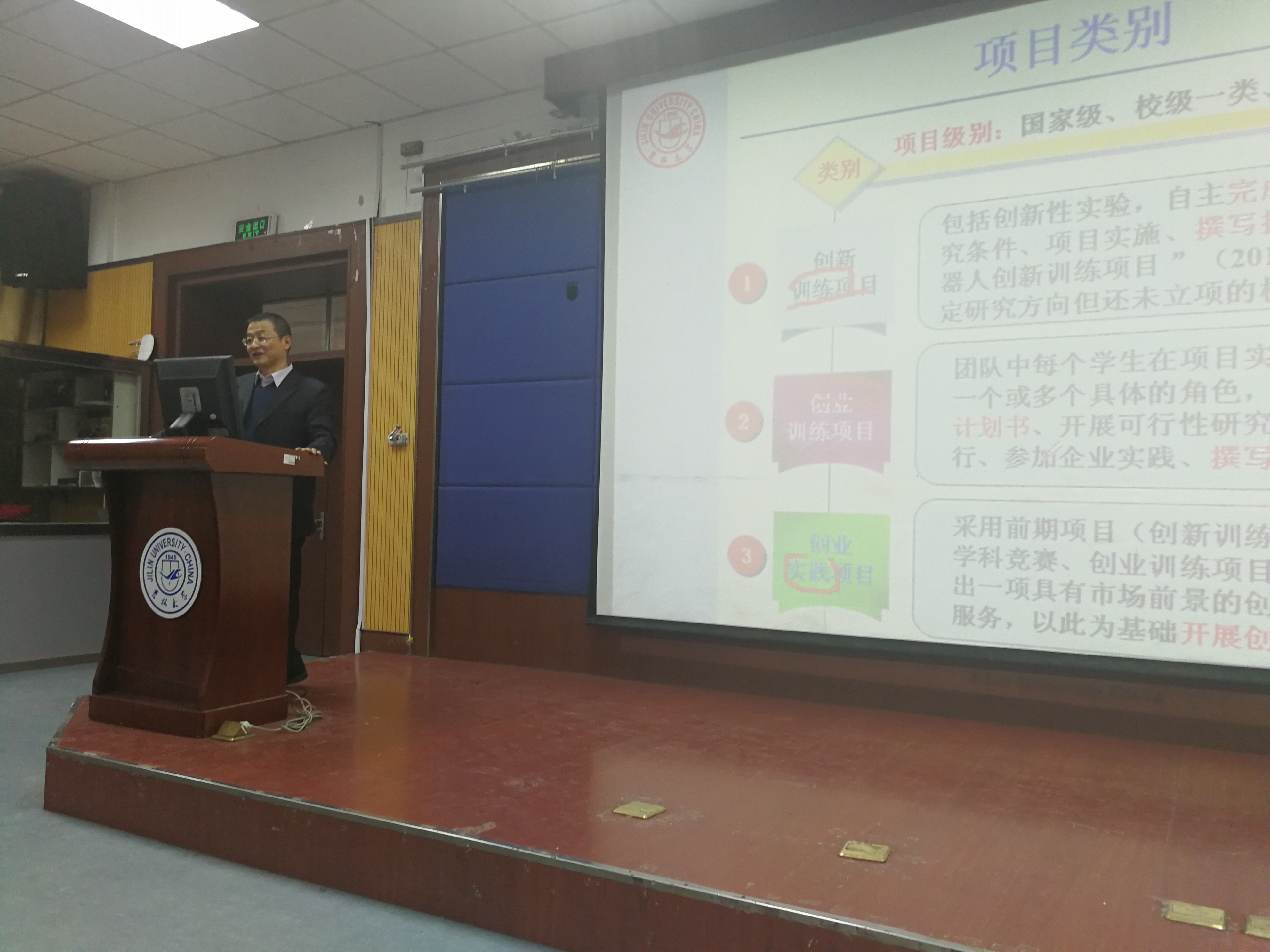 首先,赵老师对“大学生创新创业训练计划”项目类别、申报要求、项目评审依据、项目运行要求、后续中期检查及结题工作的安排和要求进行了详细的说明。然后,他强调了“大学生创新创业训练计划”项目的各种注意事项,如项目要难易适中,项目立项后不能随意终止,立项材料中填写的“预期成果”将作为结题标准等等。
