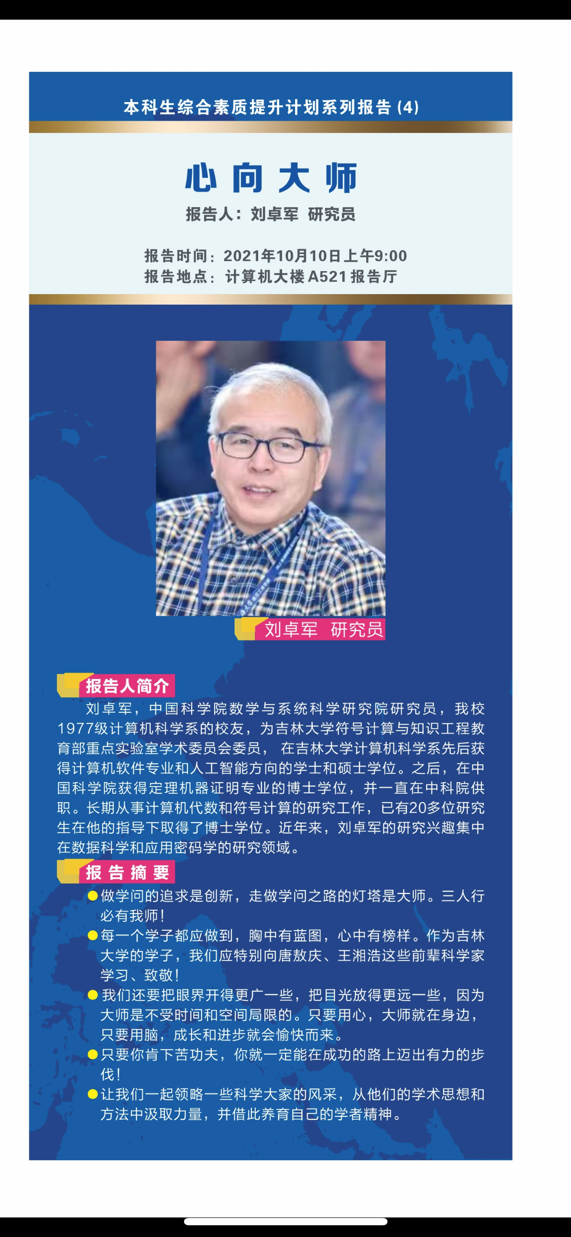 计算机科学系先后获得计算机软件专业和人工智能方向的学士和硕士学位。之后,在中国科学院获得定理机器证明专业的博士学位,并一直在中科院供职。长期从事计算机代数和符号计算的研究工作,已有20多位研究生在他的指导下取得了博士学位。近年来,刘卓军老师的研究兴趣集中在数据科学和应用密码学的研究领域。