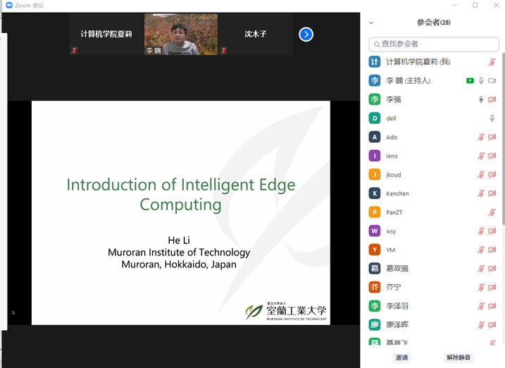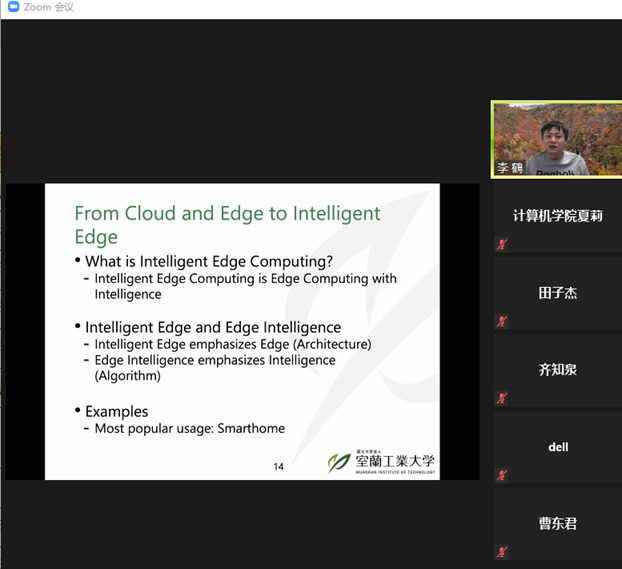 本次讲座,李鹤老师以介绍日本室兰工业大学和室兰工业大学为青年学者提供的良好的学习和科研环境,以及校方为访问学者和留学生提供的优厚的奖学金作为开场,随后李老师简单地介绍了智能边缘计算在处理深度学习任务时会采用的几种优化方法以及对应的适用条件。智能边缘计算作为智能物联网的支撑技术,在我们日常生活中的智能家居,智能交通,智能电网等重要领域可提供的高性能,高可扩展以及低能耗的计算服务。以云计算的基本概念作为基础,探讨边缘计算的发展,并介绍了当前智能边缘计算的研究方向和主要应用领域。从云计算的来源,发展以及组成形式作为导引,探讨边缘计算的产生以及重要的研究成果,引入智能边缘计算的研究问题,研究方法以及几种主要的应用。最后,李鹤老师对智能边缘计算的未来,包括需要面对的挑战以及具有潜力的研究方向等方面进行深入的讨论。讲座内容深入浅出,引人入胜。