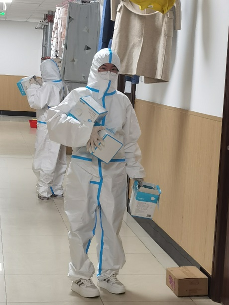 此外,封寝期间,支部很多同志主动加入了志愿者的行列,承担餐食的配送和分发、防疫物资、生活用品的搬运以及餐食垃圾的清理工作等。志愿者们每天要很早起来做准备,在防疫工作结束之后防护服里面往往都是满身的汗水。尽管如此,他们都自动自发,毫无怨言,不畏疲惫与困难,第一时间冲在前面,为同学们服务,发挥了党员的先锋模范作用。