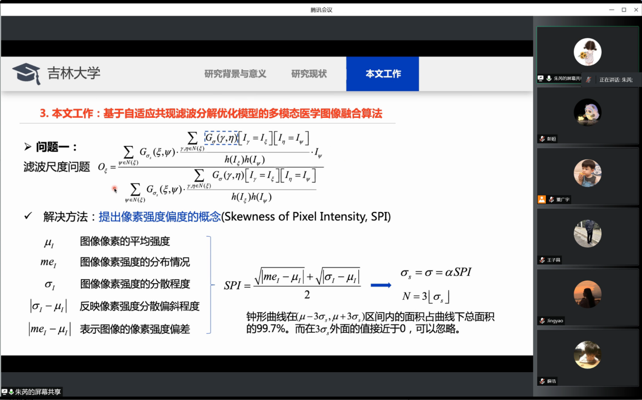 下半场,讲者朱芮围绕 “基于自适应共生滤波器分解优化模型的多模态医学图像融合”问题进行了分享。讲者指出,根据成像设备和原理不同,医学图像呈现出不同模态以不同角度反映患者的健康状态。每一种医学图像都有其特有的优势和不足。在面对复杂疾病时,单一模态的医学图像不足以提供足够的辅助信息供临床医生给出对疾病的诊断或者制定治疗方案。所以医学图像的融合有利于临床的诊断治疗。为了解决基于滤波器的图像融合方法不能够自适应地处理医学图像且需要迭代执行的问题,讲者提出了像素强度偏度(SPI) 的概念和一种基于自适应共现滤波器(ACOF) 的图像分解优化模型。实验结果表明,ACOF 方法在5 个客观指标和主观评价方面均有突出的表现。