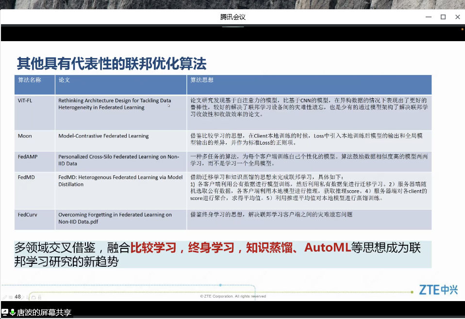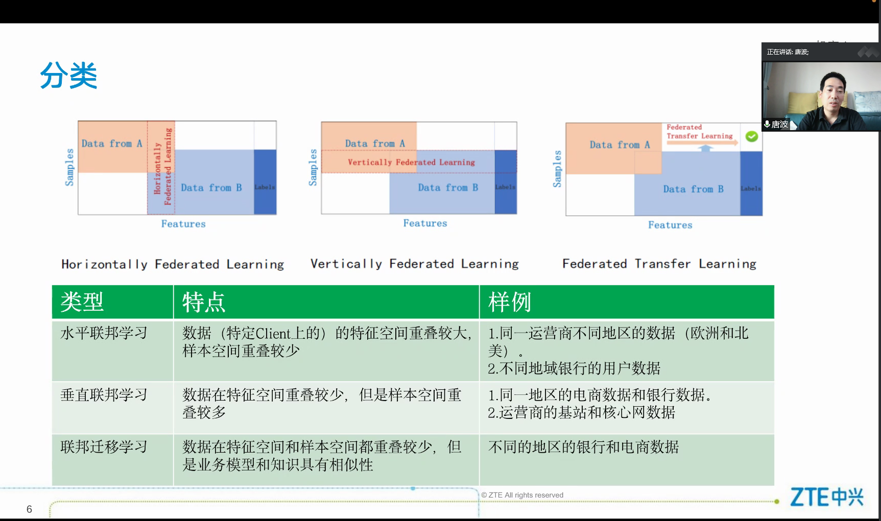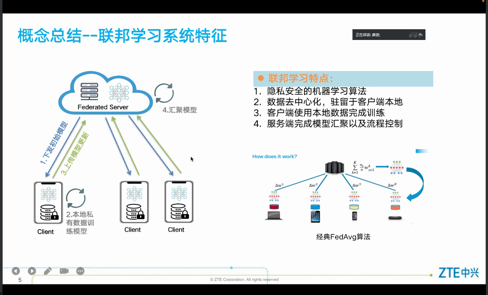 首先,报告在联邦学习背景和概念的基础上,给出联邦学习当前面临的主要问题、挑战,引出联邦学习的研究内容和方向。接着,报告给出联邦学习主要面临的安全威胁以及应对策略;差分隐私、秘密共享等隐私计算算法的基本原理以及在联邦学习中的应用;解决联邦学习性能和效率问题的相关算法,包含聚合优化算法、数据压缩算法等。最后,报告简要介绍中兴在联邦学习领域的实践以及开源项目情况。报告吸引了众多师生参与,多名同学和唐波先生进行了问题探讨。