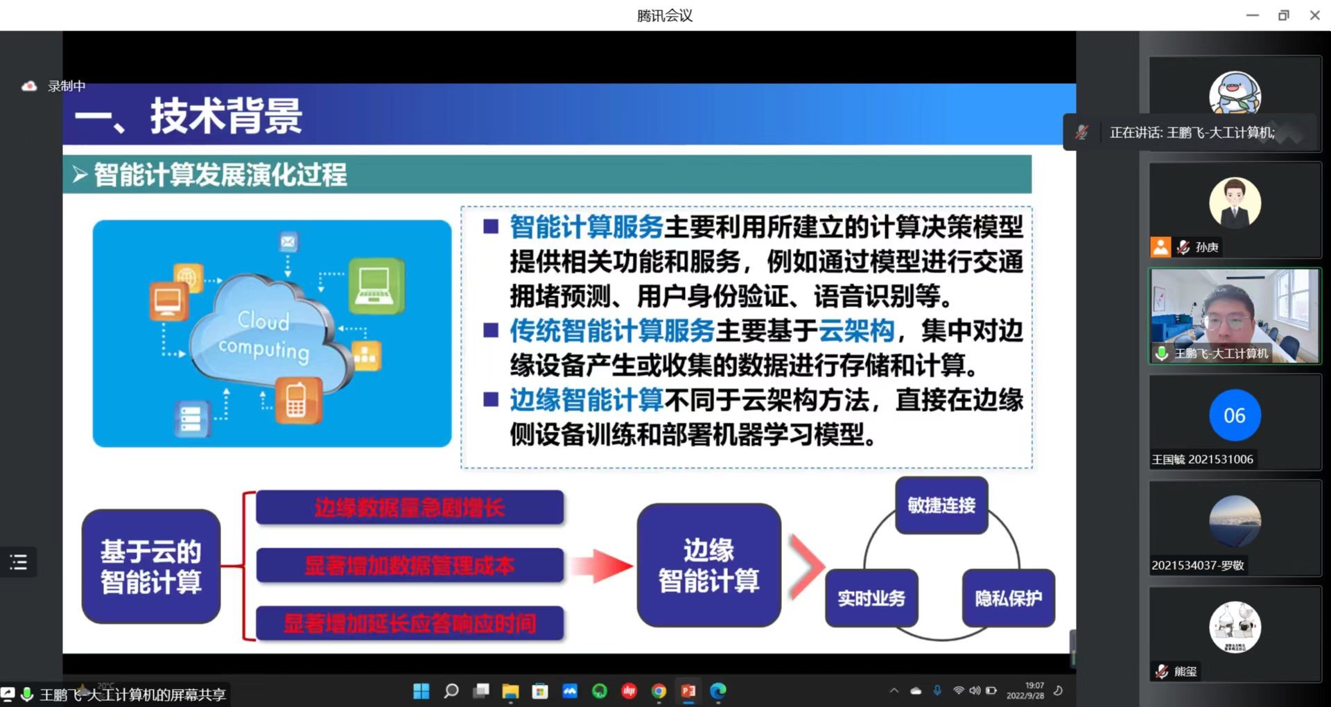 在讲座中,王老师首先介绍了边缘智能与网络优化前沿技术的相关背景,包括智能计算发展演化过程、边缘智能计算研究现状和人机混合研究现状等。随后,王老师介绍了边缘智能与网络优化前沿技术的研究动机,并指出协同利用边缘侧广泛存在的人机资源,结合人类智能及相关属性特征,研究基于人机混合的高效边缘智能计算具有重要的意义。最后,王老师介绍了所在团队围绕边缘智能与网络优化前沿技术开展的工作,包括基于社交物联网的联邦学习市场、基于人机混合的城市感知技术和任务效率保证的人机计算决策方法等。