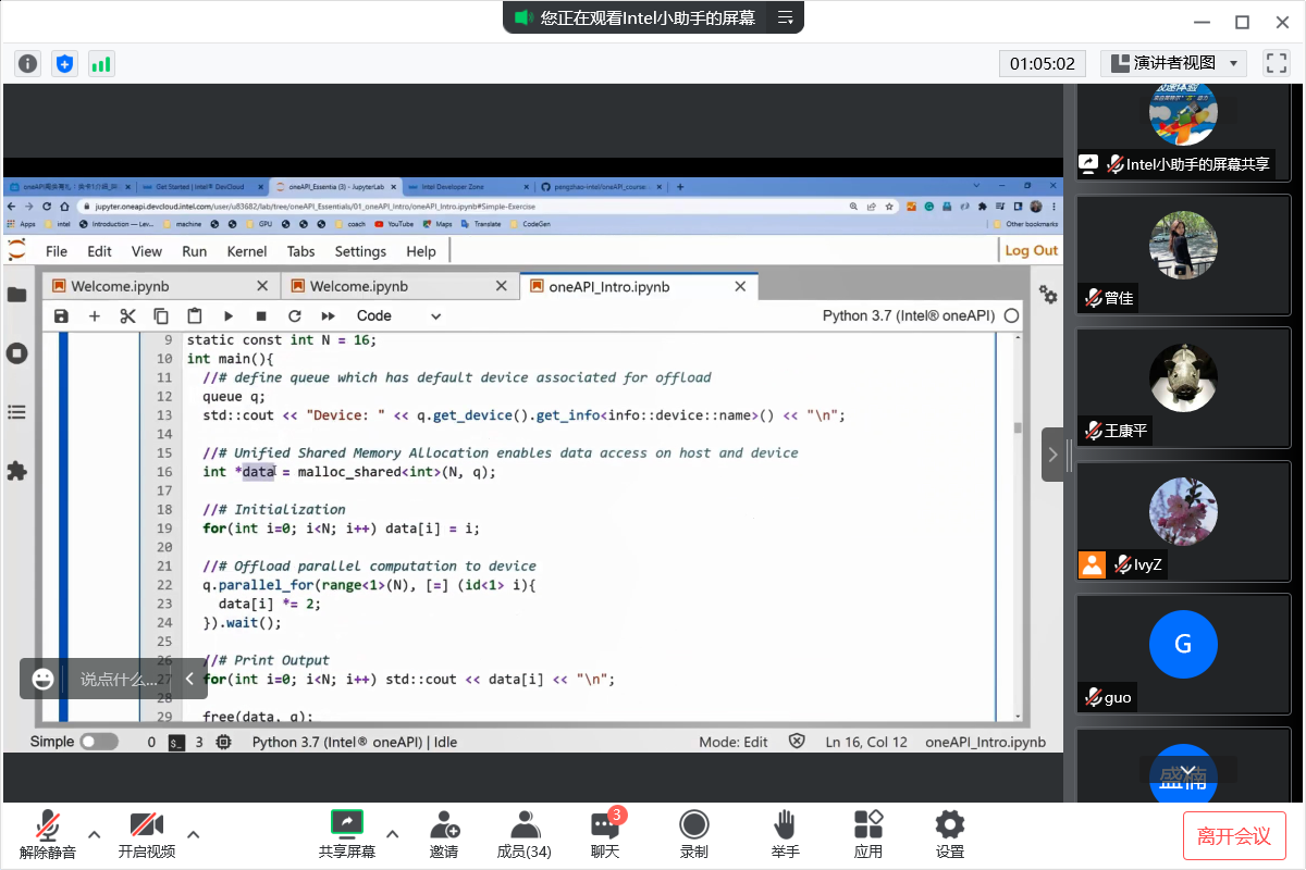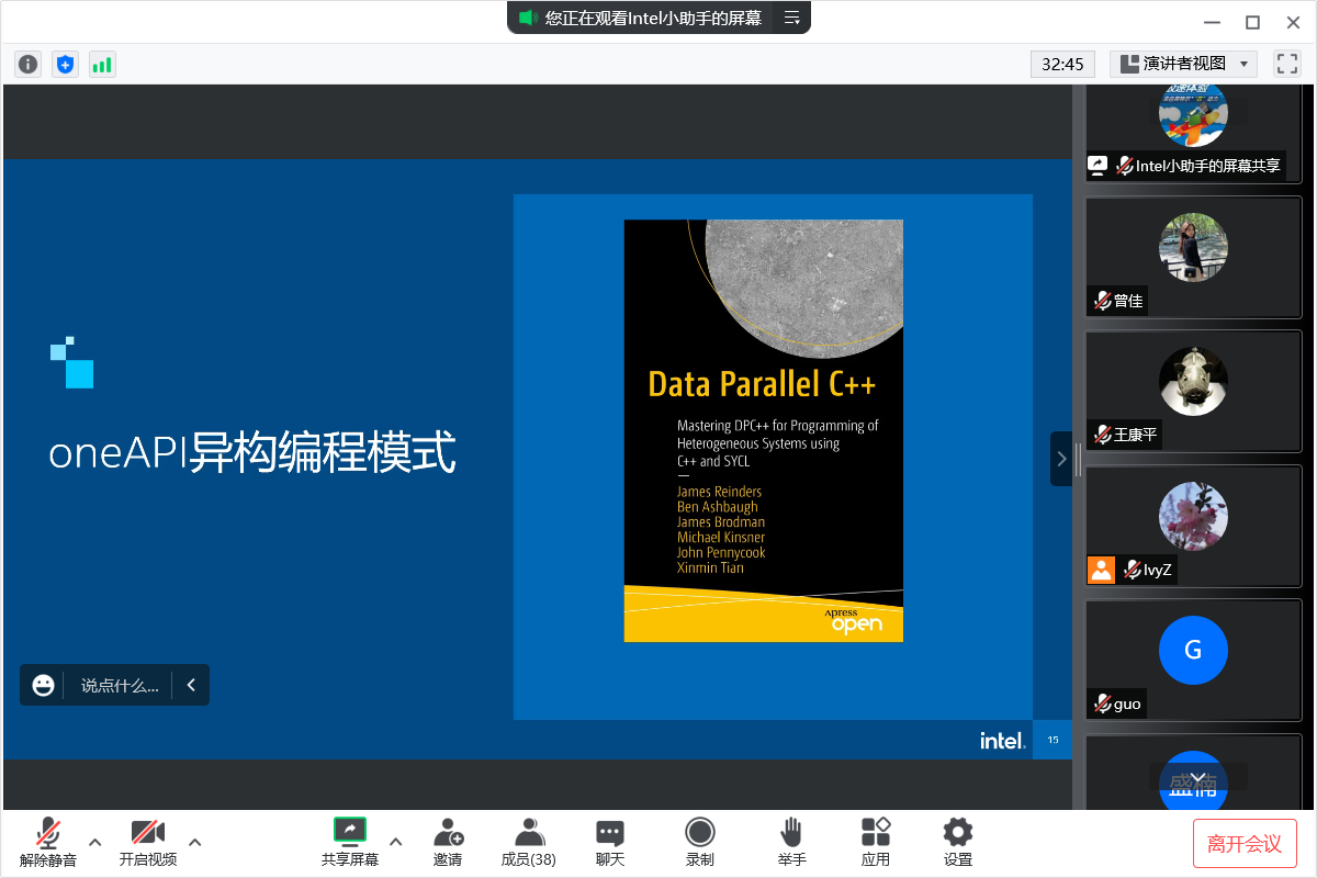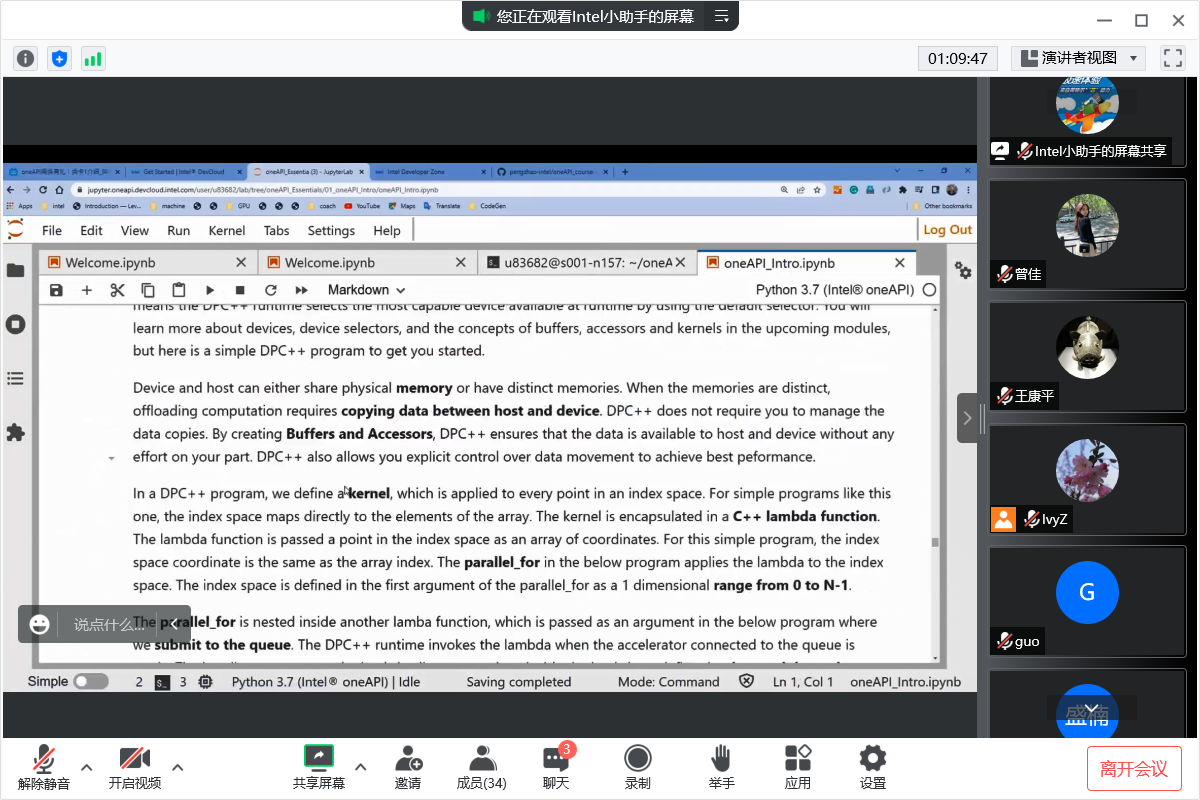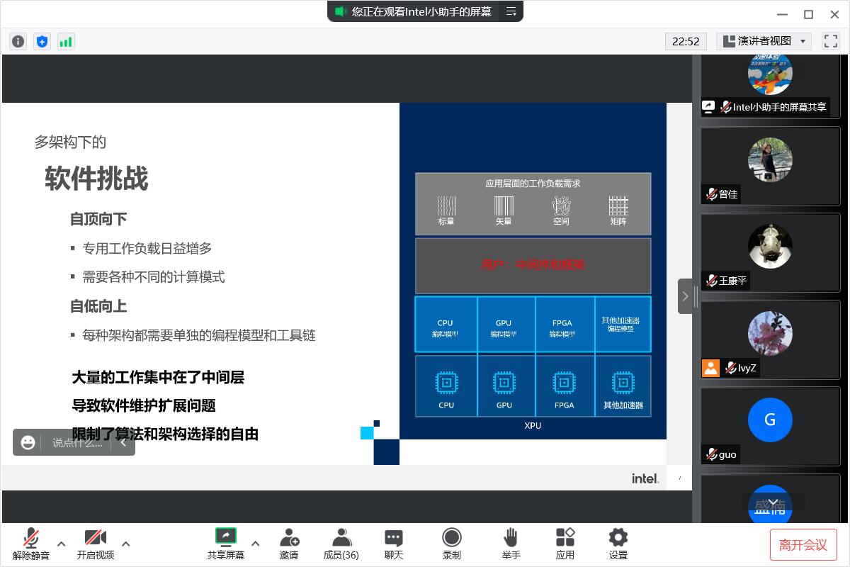 赵鹏博士首先介绍了人工智能软件的发展与挑战。现如今的人工智能算法对于算力的要求逐渐增大,传统的CPU难以满足大规模的计算需求,因此产生了多种新型架构如GPU、FPGA等,异构计算模式在人工智能领域逐渐得到大规模应用。在多架构模式下,专用工作负载日益增多,并且需要不同的计算模式,而且每种计算模式都需要单独的编程工具,导致了软件维护扩展问题。因此,赵鹏博士提出,Intel设计了名为oneAPI的编程模型,oneAPI是一种统一的开发工具组合和软件接口,可以让开发人员在CPU、GPU、FPGA、AI加速器等计算架构上实现“高效开发,任意扩展”,旨在简化并且统一跨不同架构、跨不同厂商之间的编程。oneAPI对多种人工智能生态系统实现了支持,例如TensorFlow、Microsoft Azure等,加速了人工智能和机器学习的发展。随后,赵鹏博士介绍了oneAPI异构编程模式以及为oneAPI设计的编程语言Data Parallel C++(DPC++)。DPC++存在的意义,正是为了简化编程、提高代码在不同硬件上的可复用性,并可以根据特定的加速器进行调优。赵鹏博士介绍,DPC++是基于C++语言的扩展,它提供了硬件设备的抽象、数据访问的方法以及并行化的表达。接下来,赵鹏博士演示了oneAPI异构编程,展示了一些代码样例,讲解了相关代码段及帮助文档,帮助参会者产生了更直观的感受。