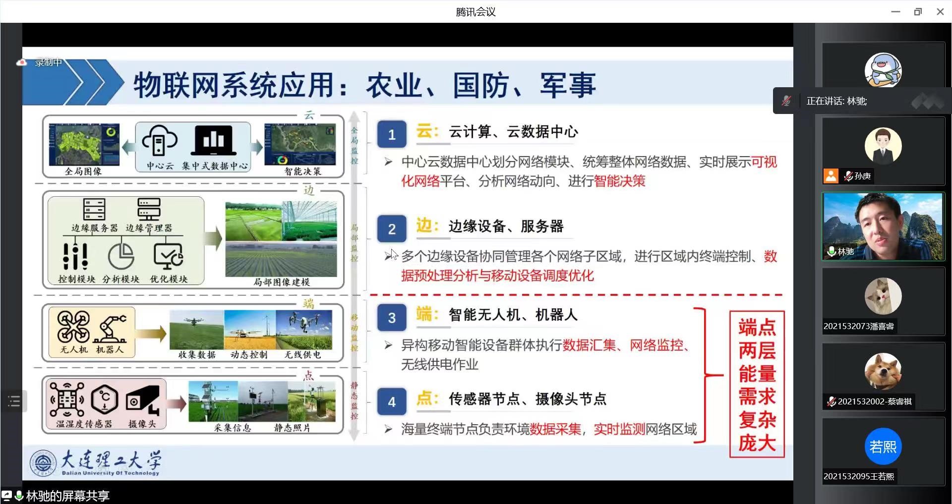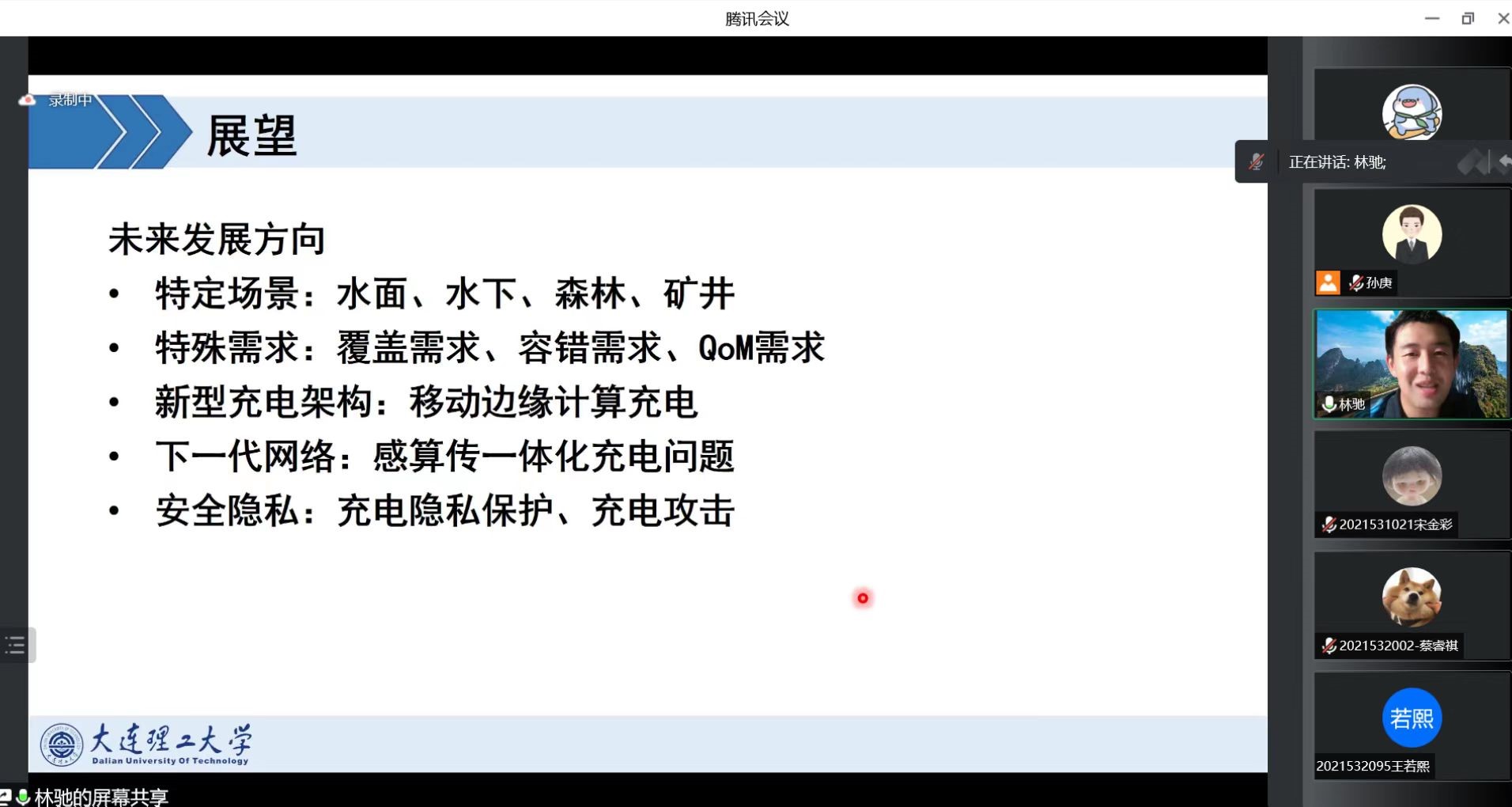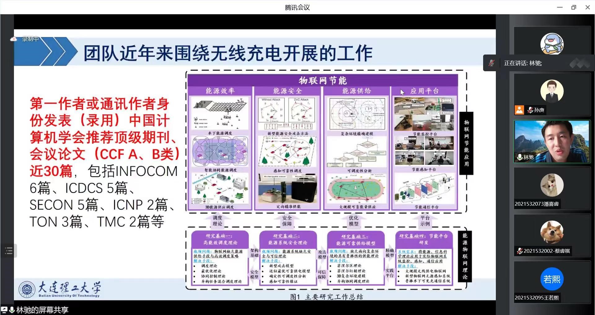 在讲座中,林驰老师以物联网系统在农业、国防和军事方面的应用入手,深入浅出地引入了无线充电技术在物联网系统中的应用以及该技术在应用过程中面临的核心问题。随后,林驰老师详细介绍了所在团队围绕无线充电技术开展的工作,包括如何在复杂环境中实现高效无线充电、如何执行无线充电混合任务调度以及如何实现无线充电系统的网络安全。最后,林驰老师介绍了无线充电技术的未来发展方向,包括在水下等特殊场景实现无线充电,移动边缘计算充电和感算传一体化充电问题等。