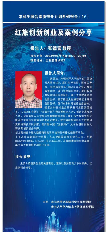 中心校区王湘浩楼A521报告厅作了题为“红旅创新创业及案例分享”的专场讲座,也是本科生综合素质提升计划系列报告第16场。讲座由河马影视