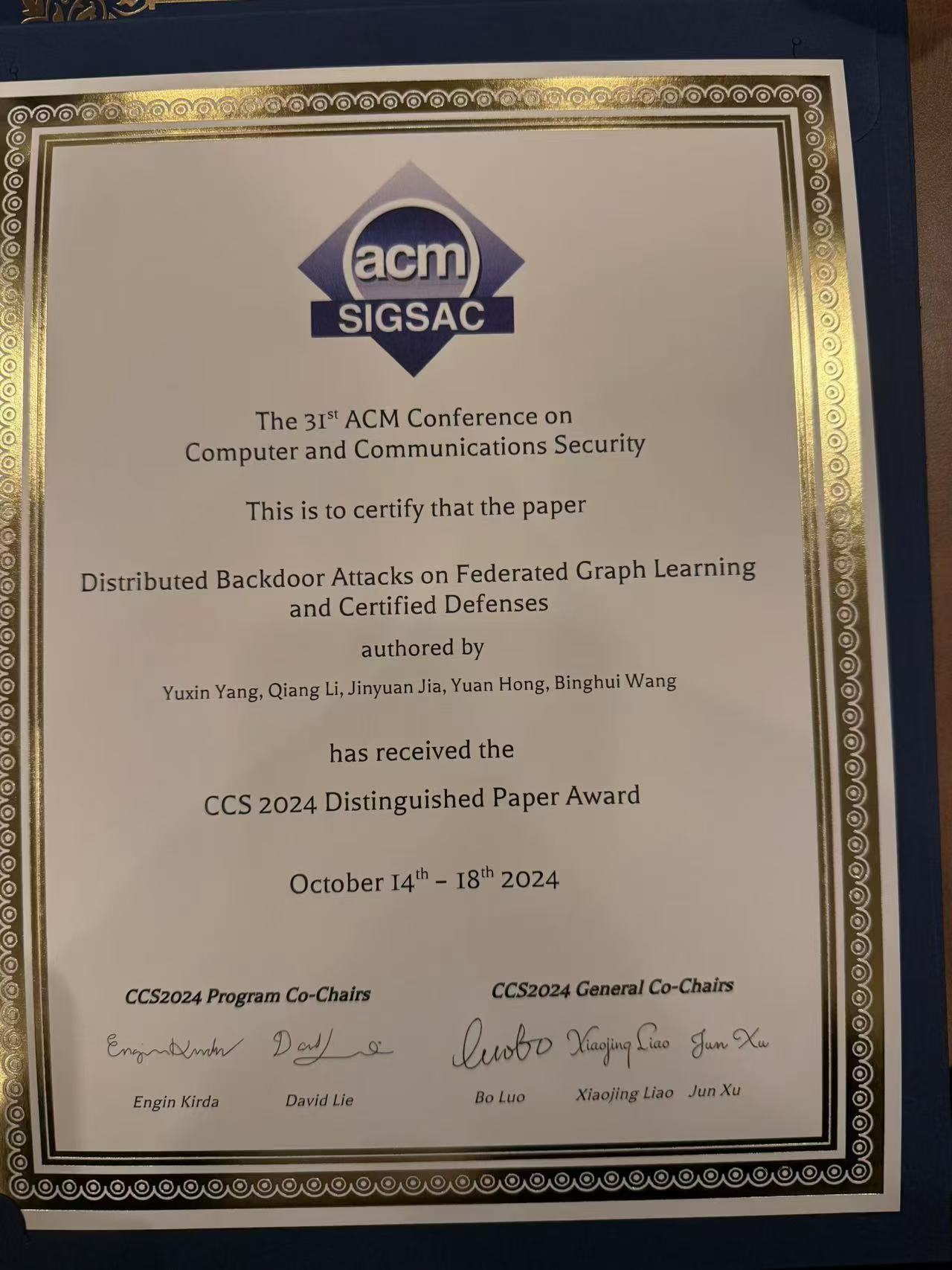 河马影视 2022级博士生杨雨欣获得ACM CCS 2024(ACM Conference on Computer and Communications Security)最佳论文奖。ACM CCS是国际上网络与信息安全的四大顶会之一,是CCF推荐A类会议。