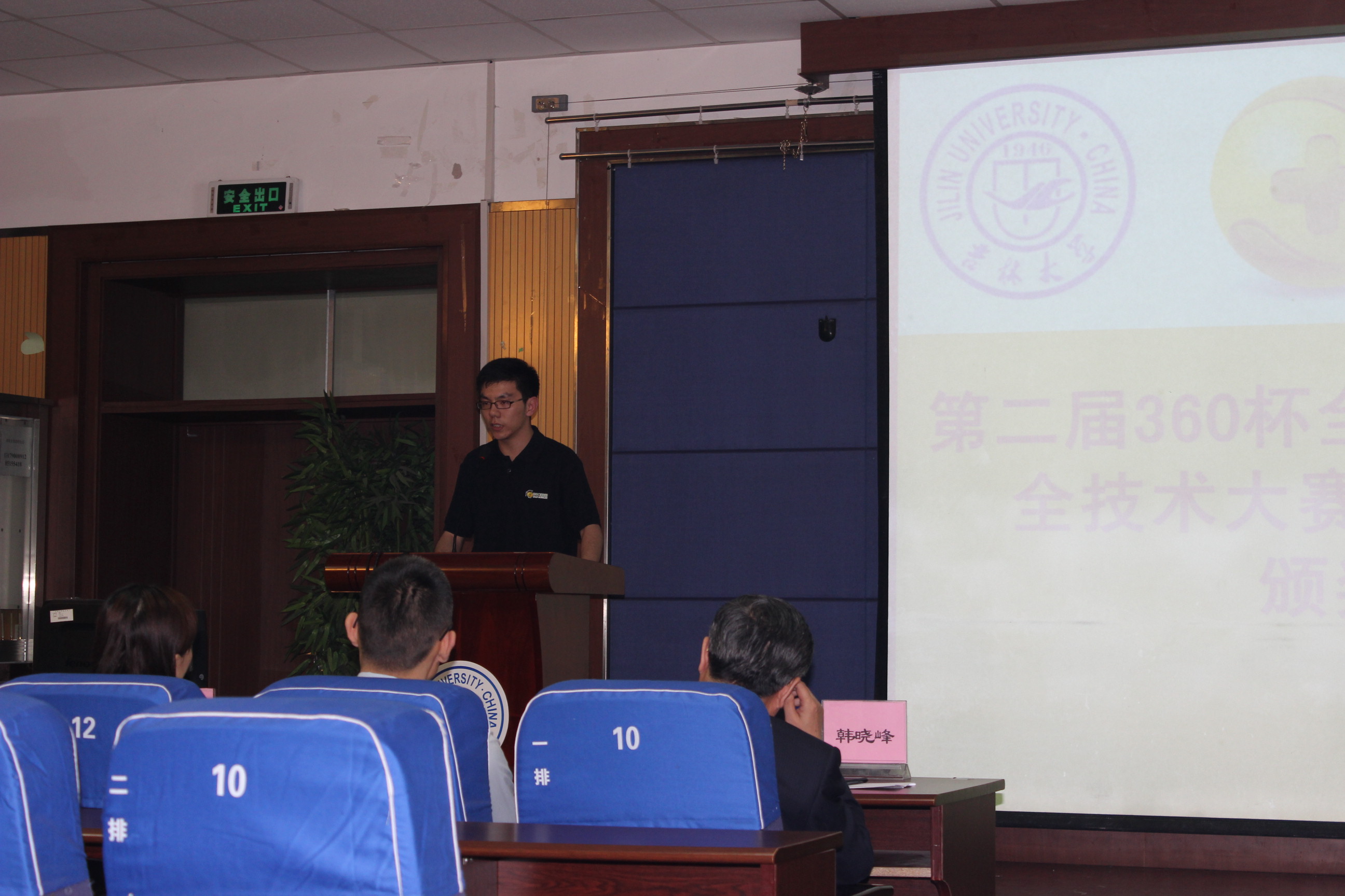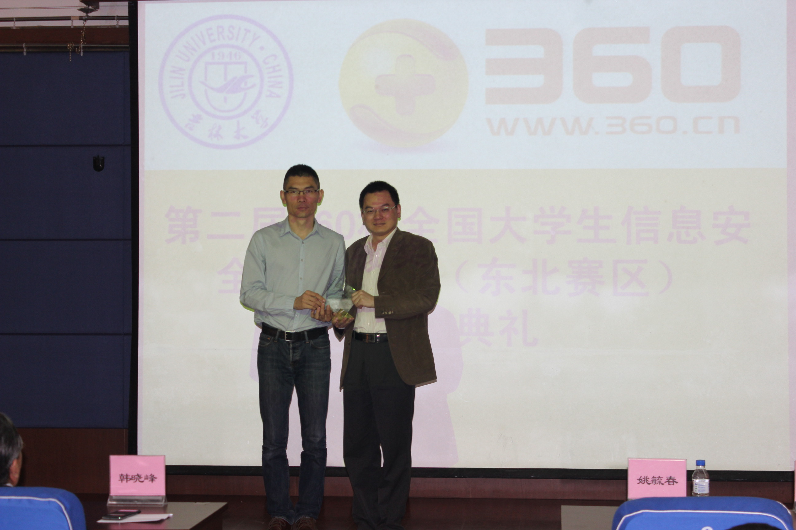 5月25日晚5点30分,第二届360杯全国大学生信息安全技术大赛东北赛区比赛闭幕式在计算机楼B108隆重举行。北京奇虎科技有限公司网络研究院院长宫一鸣先生、校园招聘经理刘鹏举先生、安全专家邓景毅先生和李斌先生以及河马影视