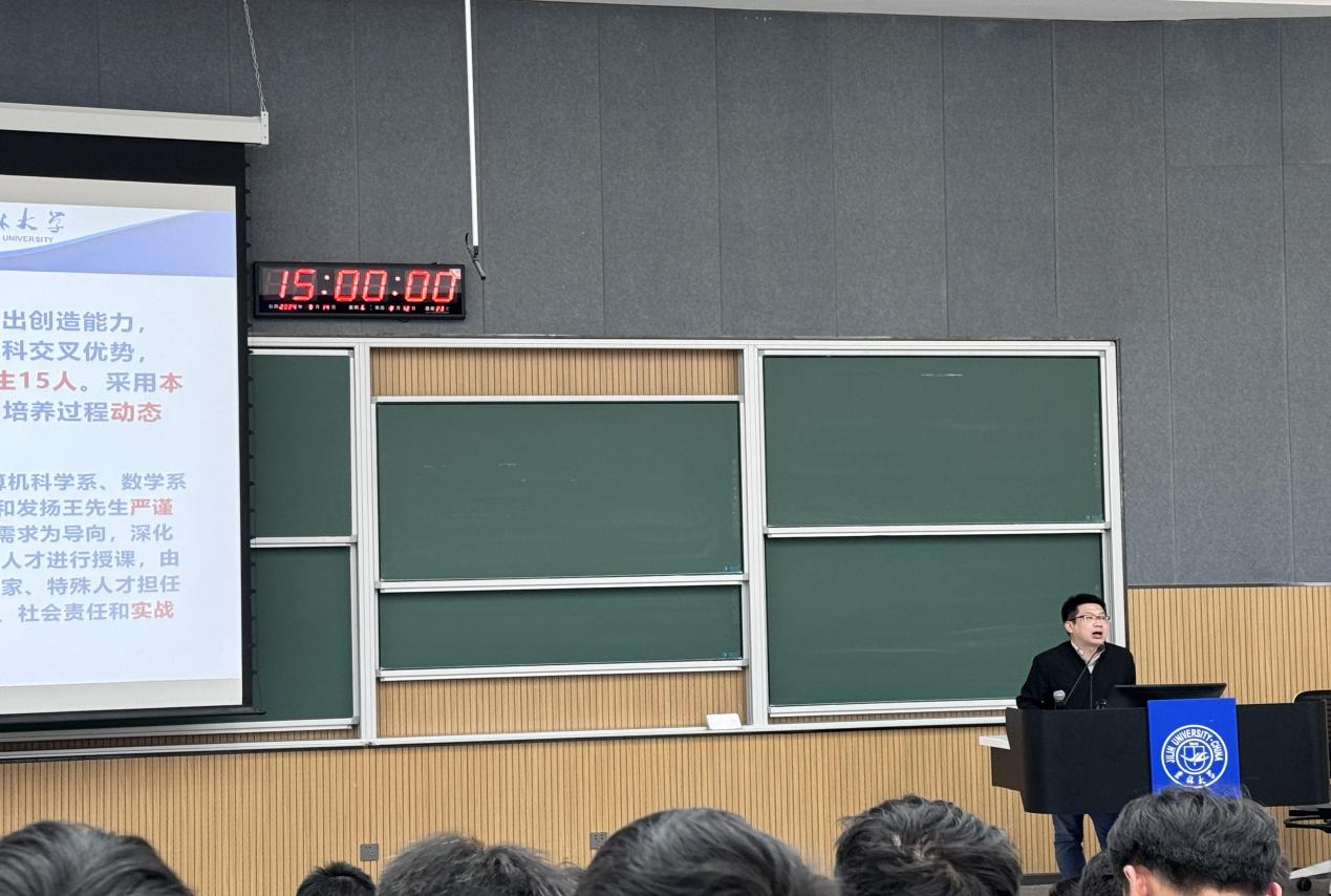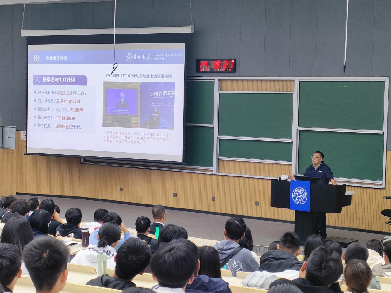 首先,由张永刚副院长介绍学院的本科专业设置和培养目标,详细介绍了2024版培养方案的修订过程和具体课程设置,从顶层设计、培养特色等方面逐层推进,让各位同学对2024版培养方案有了深入的了解。接下来,叶育鑫老师、陈娟老师、王峰老师、齐红老师分别就唐敖庆理科试验班、计算机科学与技术专业,网络安全专业,物联网工程专业,为计院的新生讲解了不同专业的学分设置、应具备的各项能力等内容,引发学生深入思考。谷方明老师、刘淼老师、曲冠南老师则分别为同学们介绍中国高校计算机系列赛事,大学生程序设计竞赛及龙芯杯CPU设计大赛的能力要求及提升途径。 一整个下午的精彩分享让新生大开眼界,不时能看到有同学举起手机拍照,拿出纸笔书写,记录重要的信息。学院将继续秉承“求实创新,励志图强”的校训,为新生们提供全方位的支持和指导,帮助他们在计算机科学的道路上不断前行,实现自己的理想!