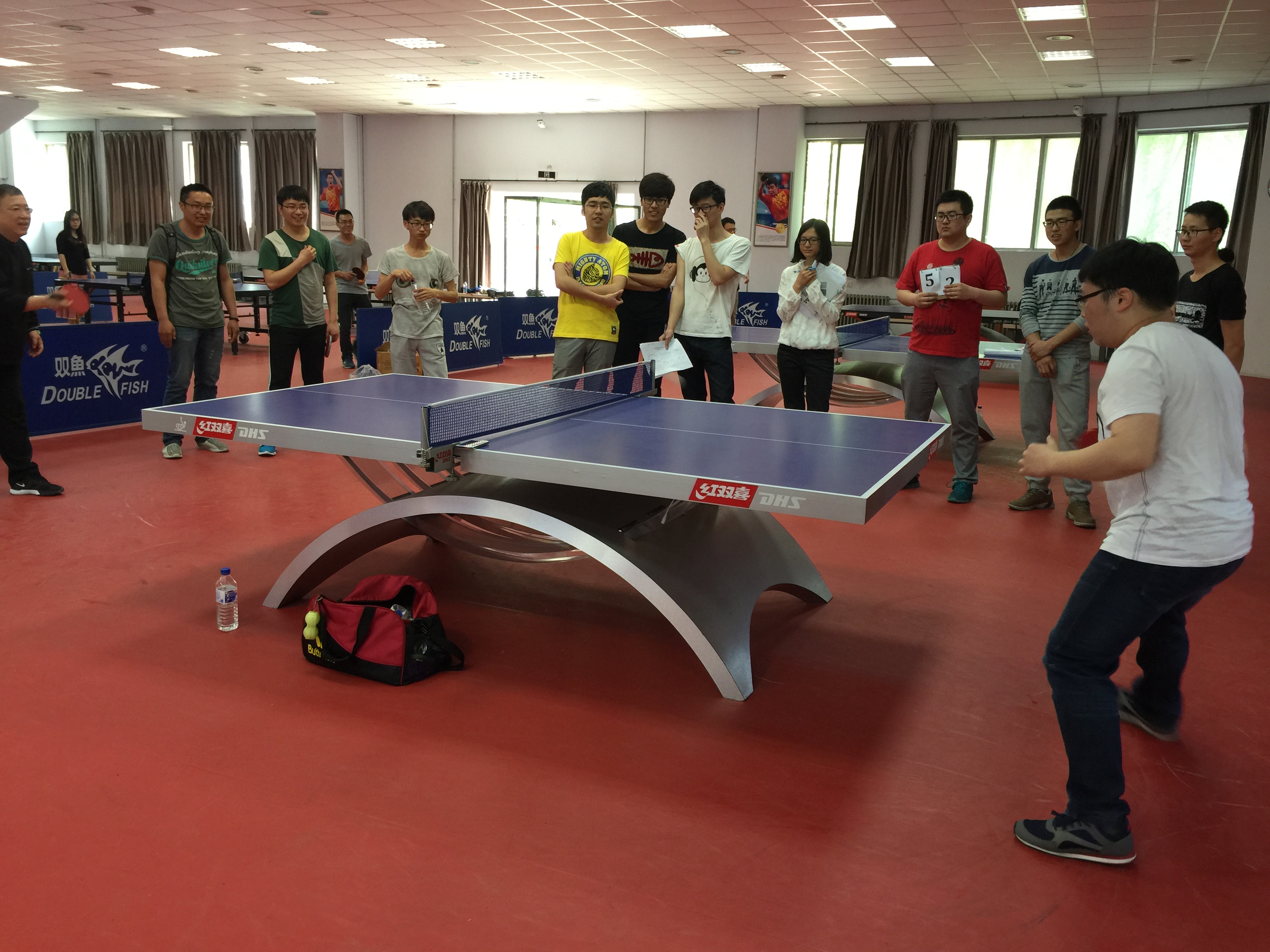 2016年5月21日上午9:00,乒乓球赛在中心校区体育馆准时开赛,计算机学院团委研究生会组织部和女生部负责对赛事进行了宣传,组织和策划,其他部门协助执行比赛。乒乓球作为国球运动,显然同学们的准备都更加充分,技艺也都更高一筹。比赛过程中,选手们热情洋溢,精神饱满,充分展示他们高超的球技,攻球时而迅猛激烈,时而温柔舒缓,切、挑、劈、点,每个动作都拿捏得恰到好处。在小组赛时,男子组的对决就已扣人心弦,选手们各个身怀绝技,在赛场上展开了激烈的争夺,充分展现了“敢打敢拼”的进取精神,赛场气氛一度升温;而隔壁的女子组的比赛,真可谓是巾帼不让须眉,发球挥拍、正手反手都运用自如、出神入化,比赛过程更是跌宕起伏,精彩连连。最后进行的决赛,搓发球、弧圈球以及绝杀球不断,使整场比赛达到了高潮,引来了观众的阵阵叫好。最终,男子组由朱晓东老师大比分领先获得冠军,女子组由李林林获得冠军。